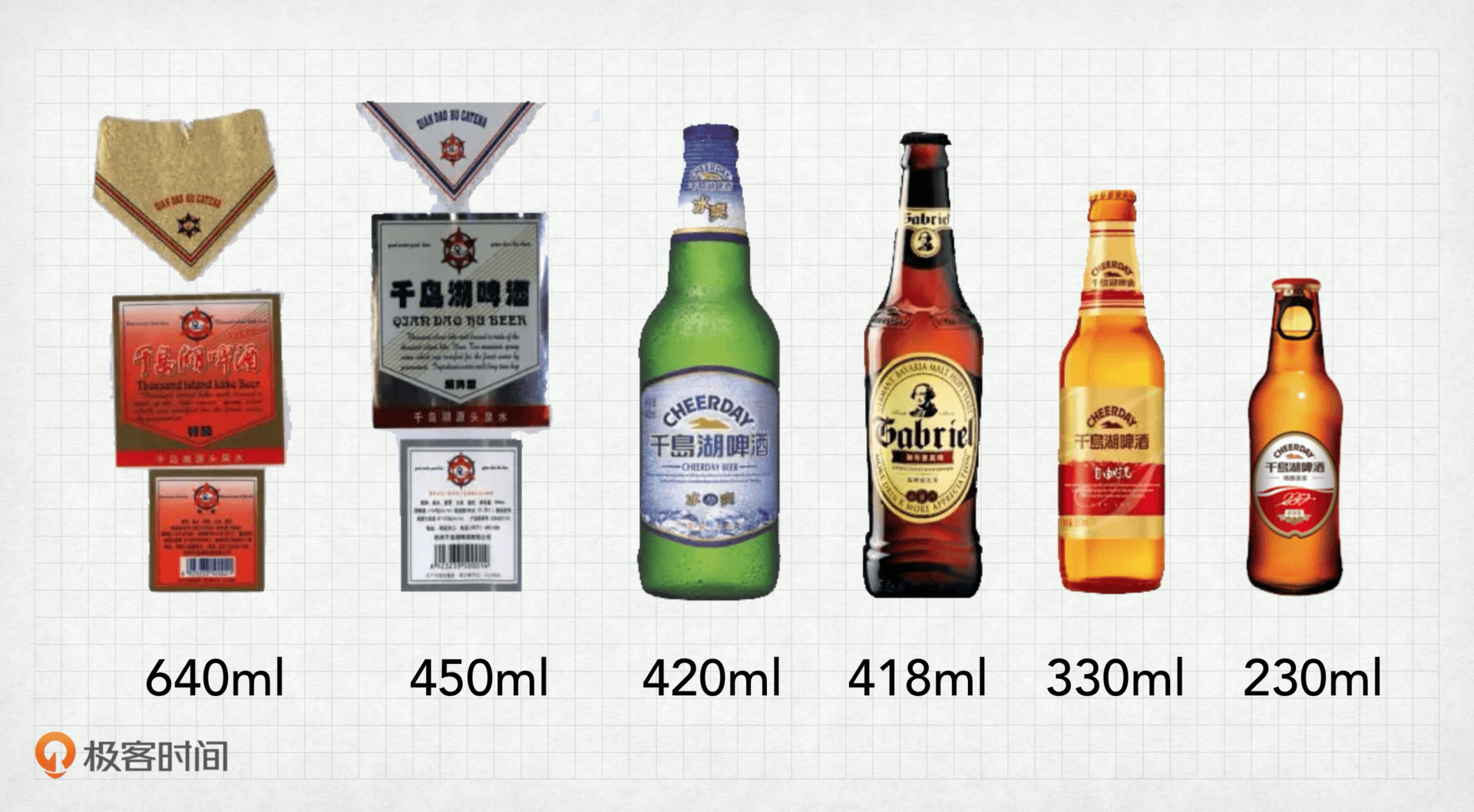 图中千岛湖啤酒单瓶的样子是按照时间顺序排列的,你会发现一个明显且有趣的规律,就是它的瓶身越来越小了。为什么?你也可以暂停音频思考一下。在我看来,最本质的原因就是“适应场景包装”,用户需求场景变了。