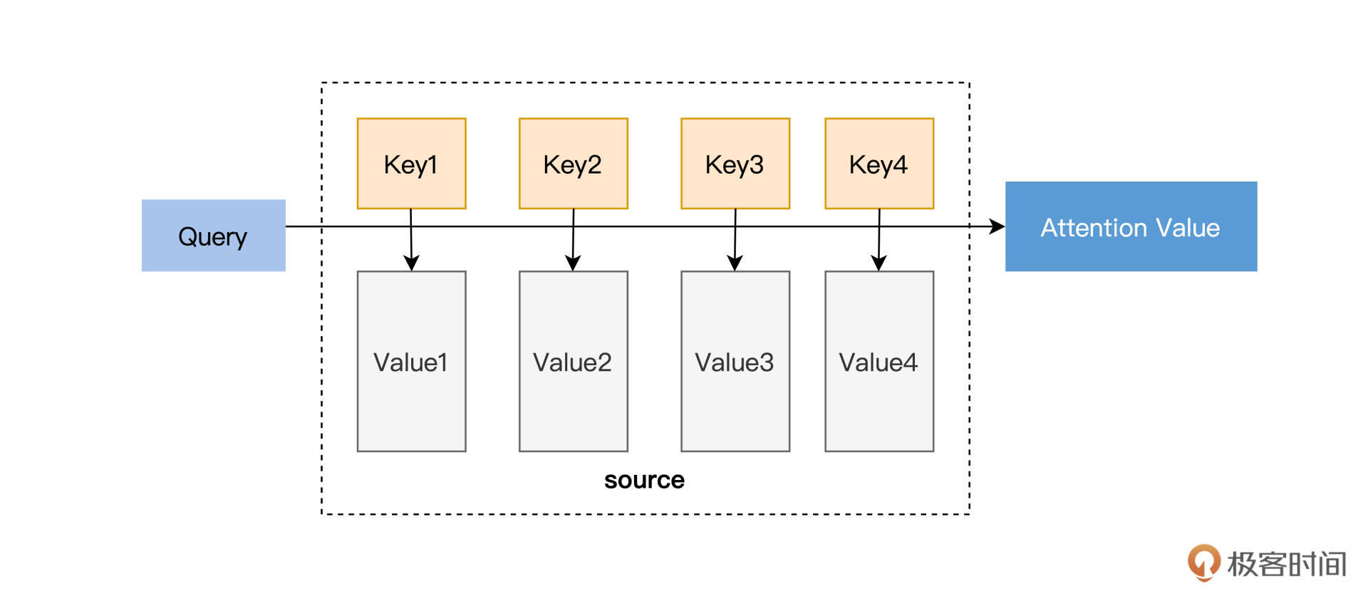 你看,这个注意力机制的原理其实很简单,但是也很巧妙。只需要增加很少的参数,就可以让模型自己弄清楚谁重要谁次要。那么下面我们来看一下抽象化之后的Attention,如下图,这张图想必你应该在很多attention的相关介绍中见过了。