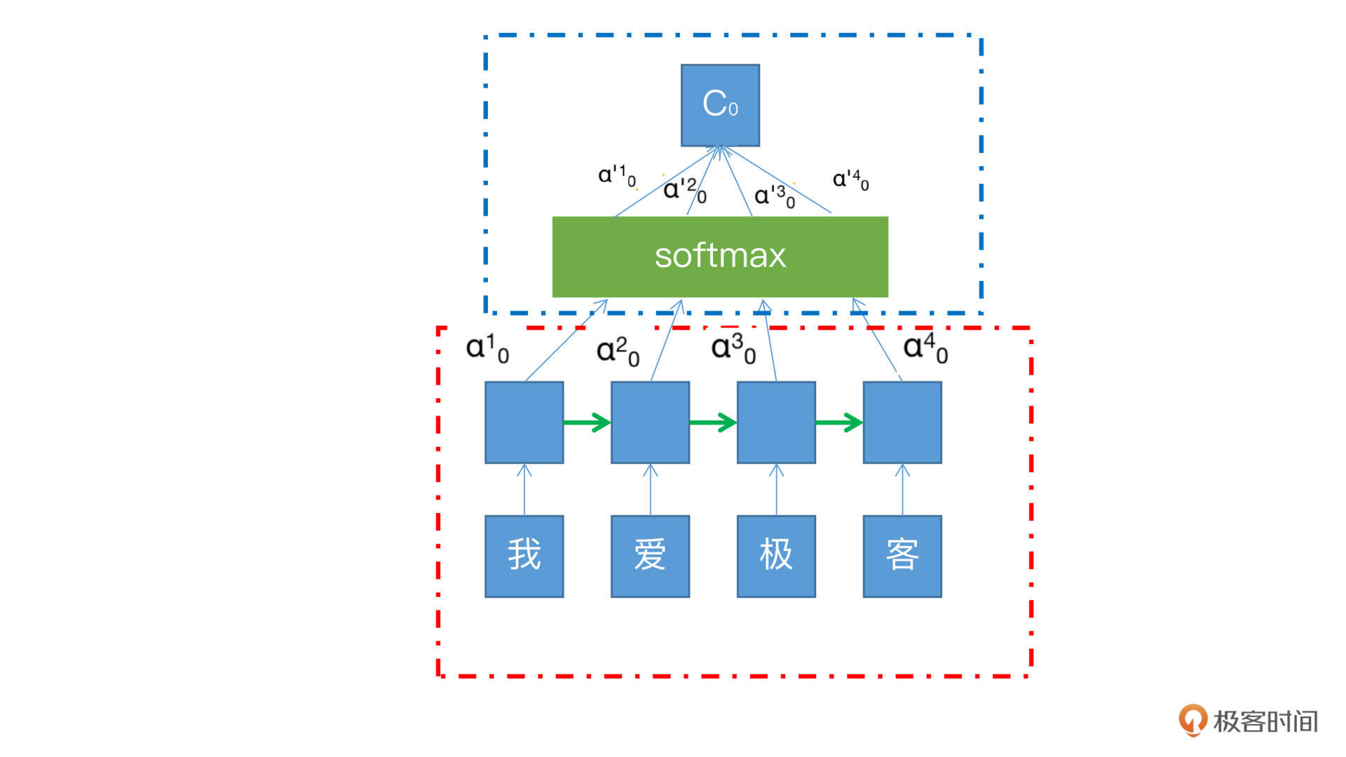 下面这张图是Attention机制和RNN结合的例子。其中红色框中的是RNN的展开模式,我们可以看到,我/爱/极/客四个字的向量沿着绿色箭头的方向传递,每个字从RNN节点出来之后都会有一个隐藏状态h,也就是输入节点上面的蓝色方框,在这个过程中每个状态的权重是一样的,不分大小。