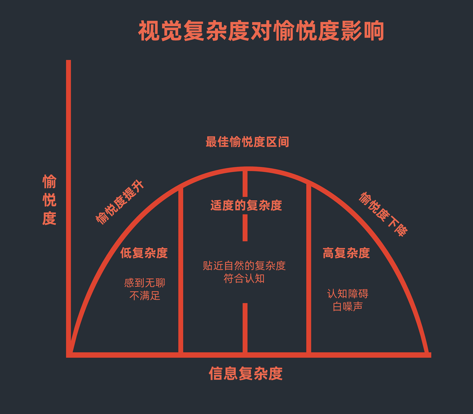大量心理学和人机交互的实验表明,人们对视觉复杂度的愉悦性认知是一个反U形曲线。人们不喜欢过于简单或者太过复杂的图案,复杂度适中的图案愉悦性最高。