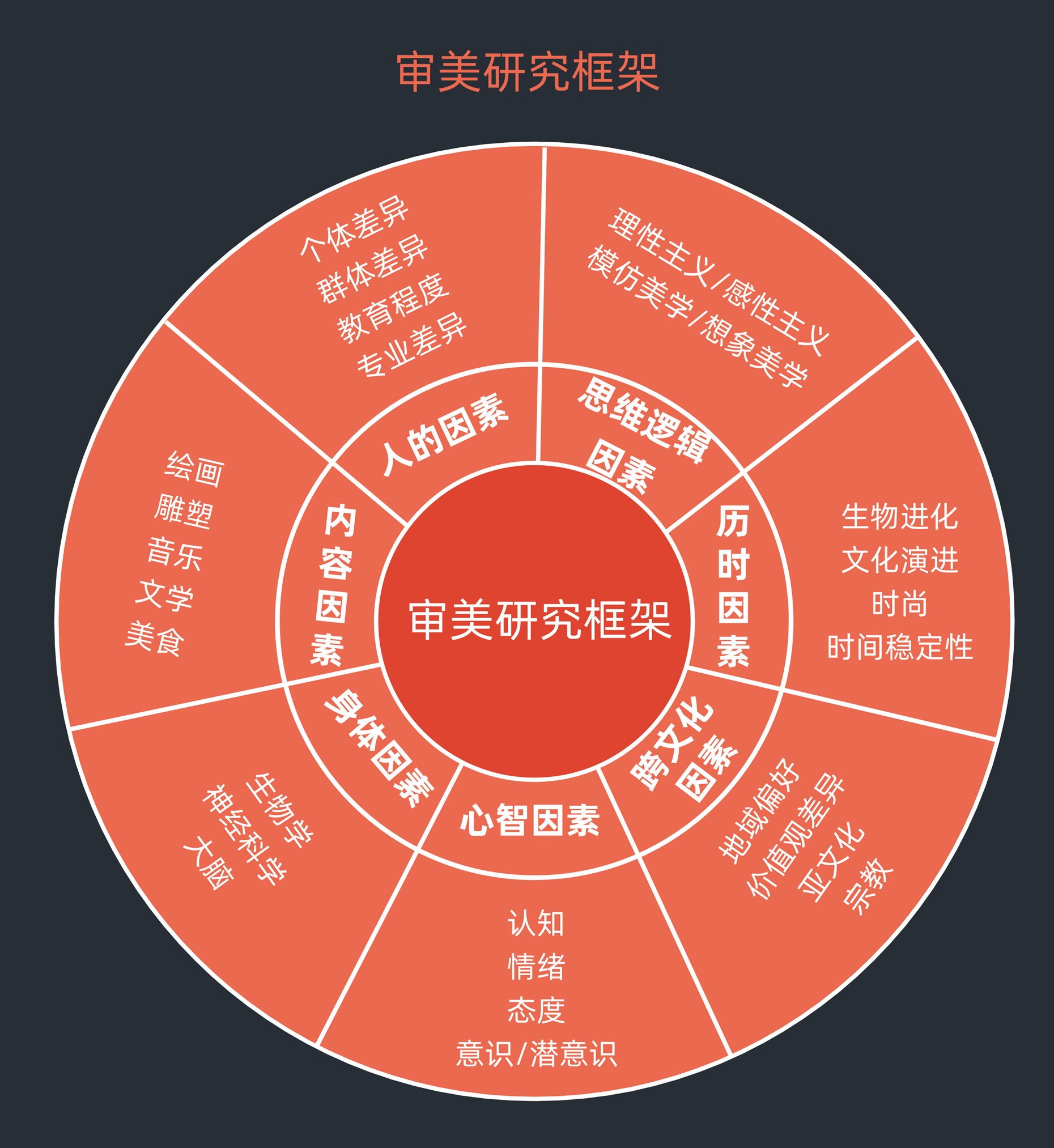 下图是一个理解美学的基础研究框架,这里面会有人的因素、思维逻辑因素、时间因素、跨文化因素、心理学和生理学因素,以及表达美学的载体:内容的因素。
