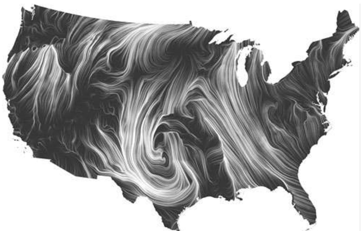 除了自然和实验模拟的混沌,在大数据时代,海量的元数据本身就是一种混沌。这些元数据的视觉表达往往会传达意想不到的美学体验。比如下图就是创作者把气象图的原始数据进行叠加视觉处理,最终形成了绚丽的艺术作品。