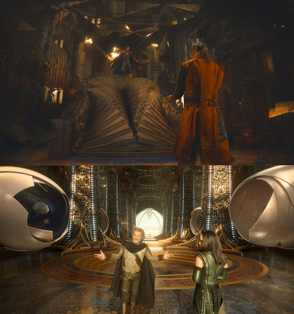 我们在自然界能观测到的分形多为静态生成,比如树枝的生长、北方窗户上的冰晶、葵花籽的螺旋排序。任何动态或者夸张展示分形的艺术和设计,都会在人的认知层面给人非常强烈的魔幻、神秘、未来、哲学的反思层的体验激发。因此你也会在很多表达类似主题的场景中看到这种设计,例如漫威电影中的《奇幻博士》和《银河护卫队》。