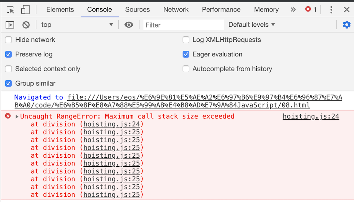 那为什么会出现这个问题呢?这是因为当JavaScript引擎开始执行这段代码时,它首先调用函数division,并创建执行上下文,压入栈中;然而,这个函数是递归的,并且没有任何终止条件,所以它会一直创建新的函数执行上下文,并反复将其压入栈中,但栈是有容量限制的,超过最大数量后就会出现栈溢出的错误。