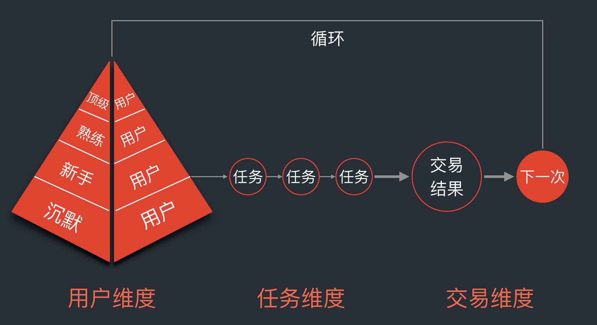 - 基于用户生命周期的体系:以人为中心,适用于观察产品的用户健康度和分层画像。