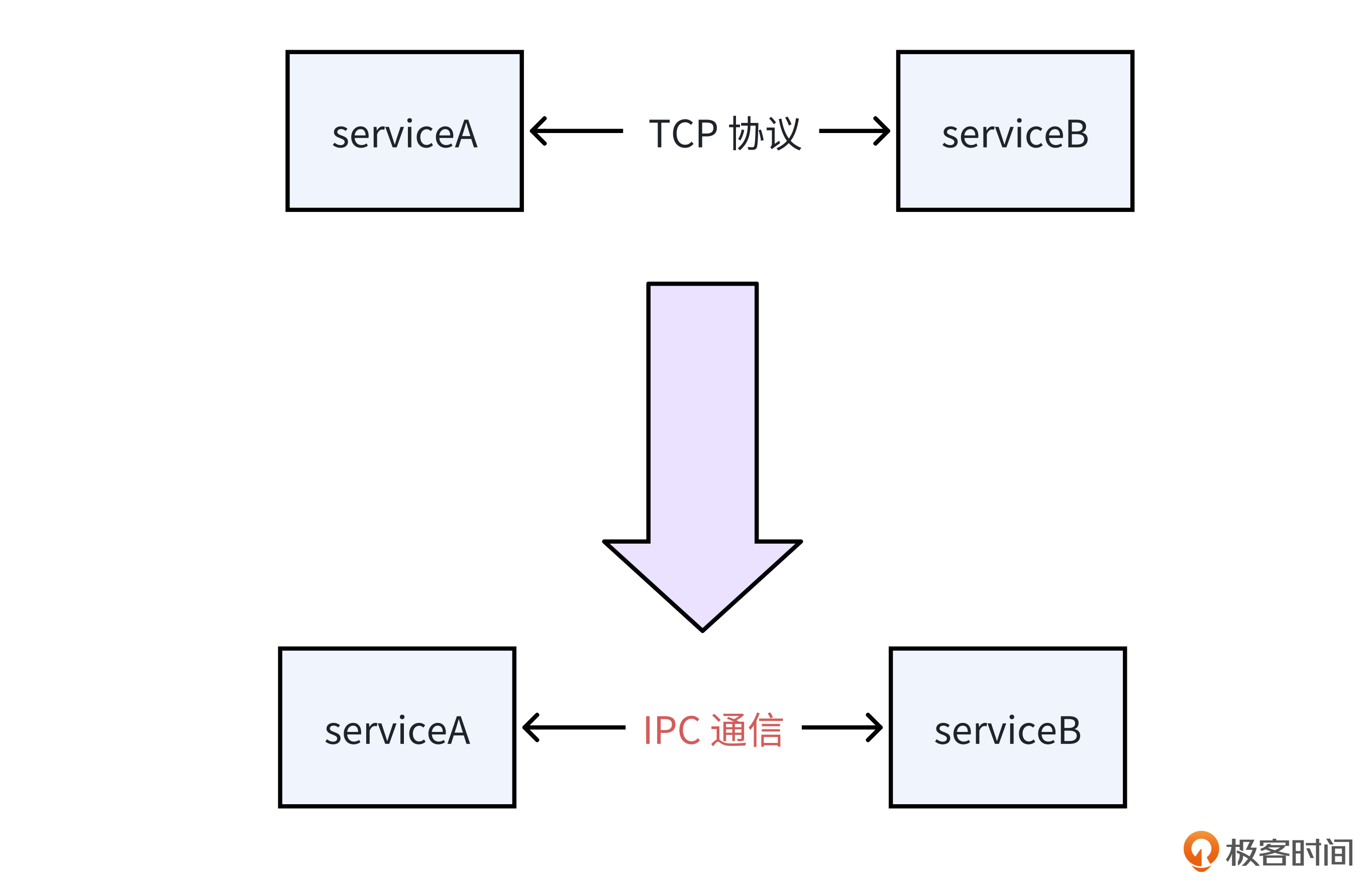 亲和性部署策略除了将服务之间的远程通信变成同机通信之外,为了减少复杂TCP协议通信所产生的开销,它还会将通信方式换成IPC通信(也就是进程间通信),比如共享内存通信,从而使两个服务之间的数据传输更为高效,数据传输的资源消耗也更低。