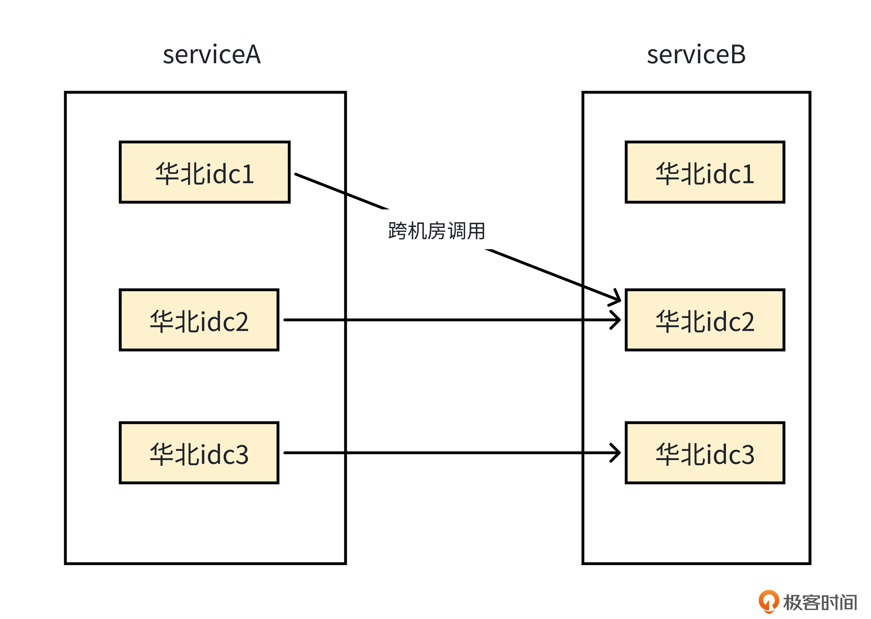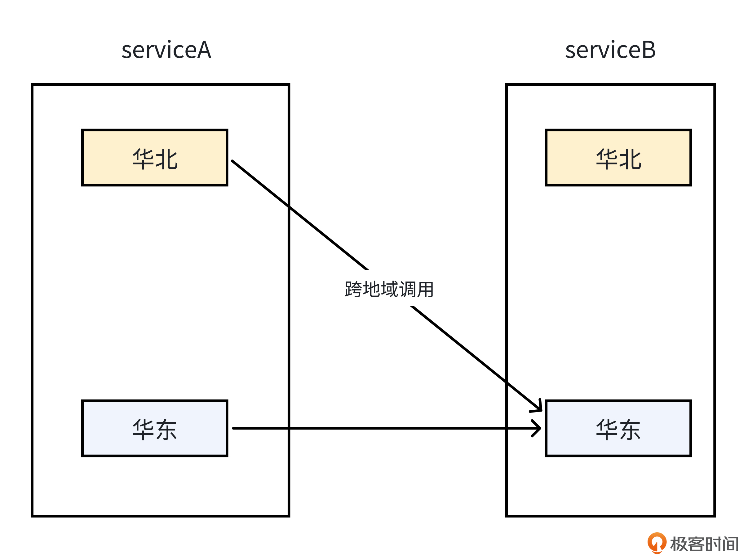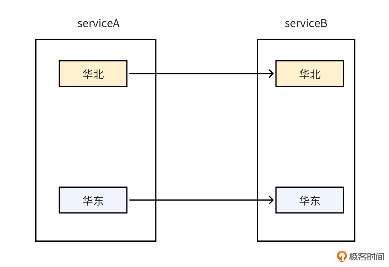 第一个策略是,当两个服务在多地域有部署时,Client和Server不进行跨地域调用。比如,以下面的图为例,服务A在华北区域的服务器,只调用服务B在华北区域部署的服务器,尽量不要跨地域去调用服务B在华东区域部署的服务器。