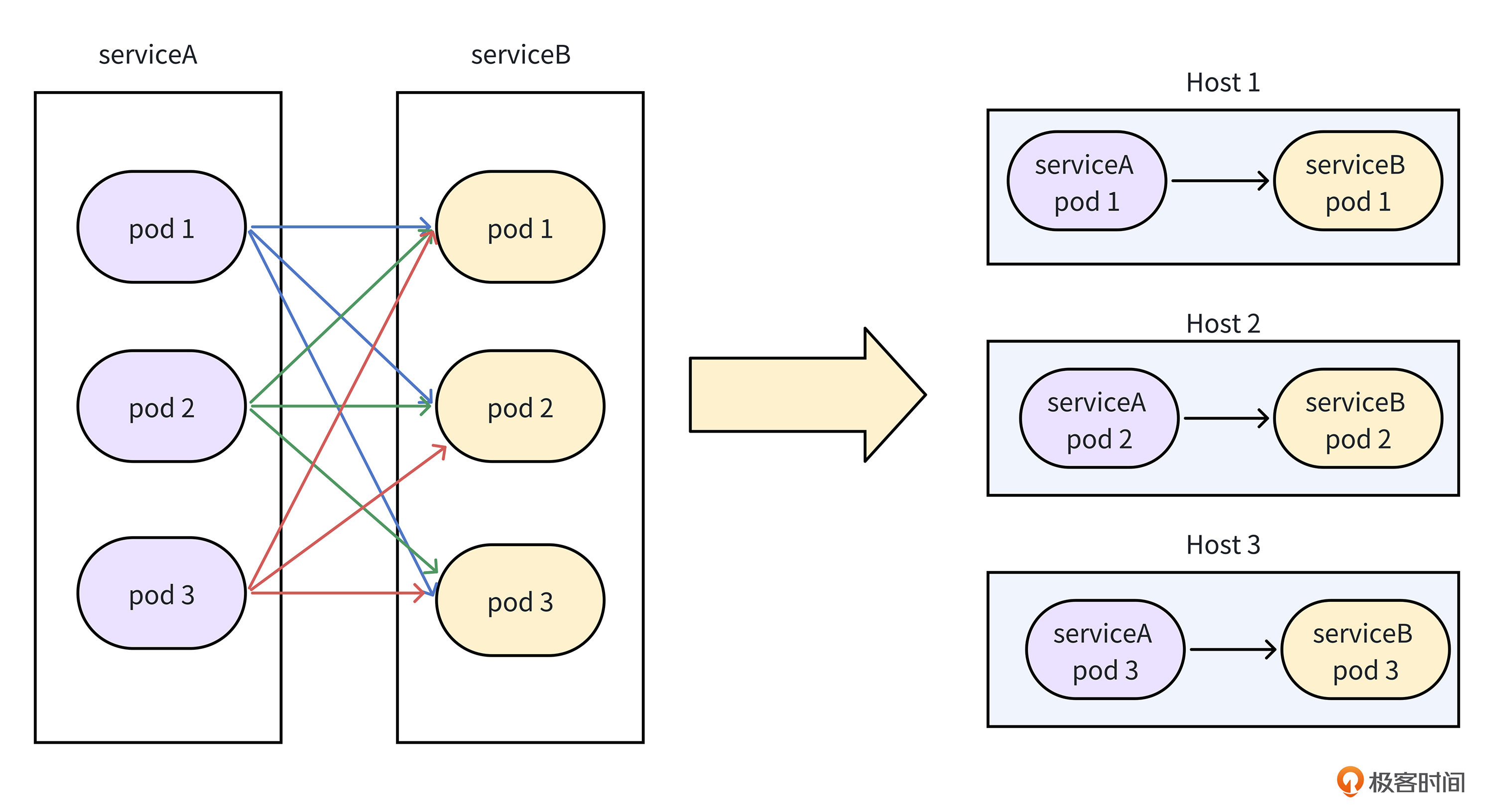就像下面的图展示的一样,你还可以将两个服务,尽可能地部署到一台物理机上,这样当Client发起请求调用时,可以优先调用同一个物理机上的Server,从而达到完全消除网络传输开销的目的,这就是亲和性部署策略。