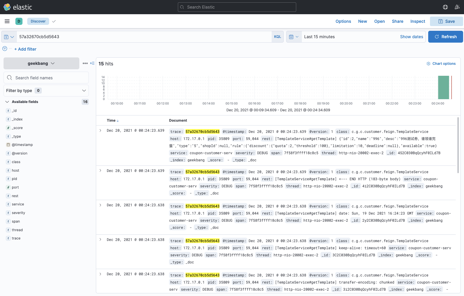 到这里,我们就完成了所有的对接工作。接下来,你只要在本地启动微服务项目,然后发起几个服务调用,生成一些Log文件,我们就能够在Kibana中查看到日志信息了。