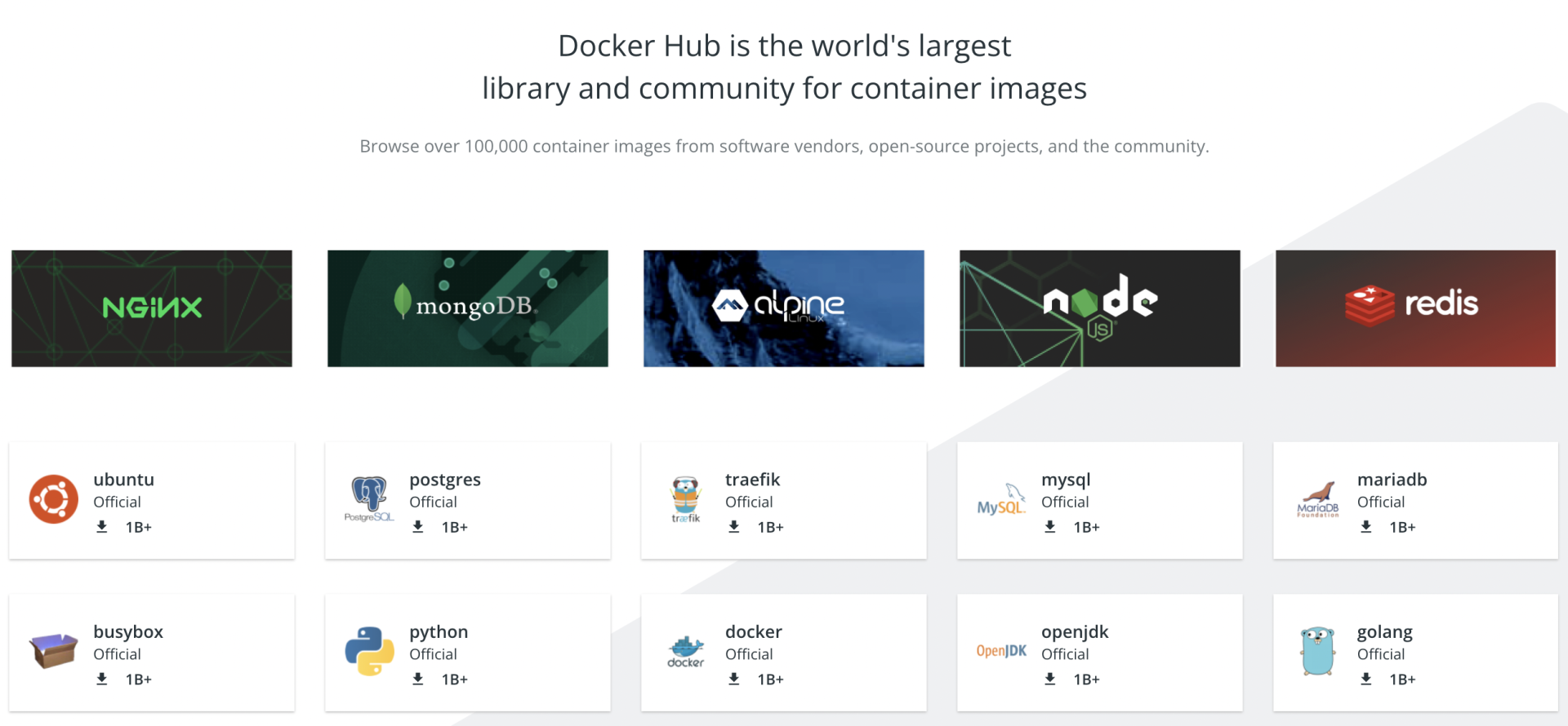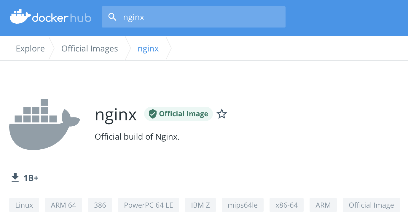 你可以看看下面的这张截图,里面列出的都是下载量超过10亿次(1 Billion)的最受欢迎的应用程序,比如Nginx、MongoDB、Node.js、Redis、OpenJDK等等。显然,把这些容器化的应用引入到我们自己的系统里,就像是站在了巨人的肩膀上,一开始就会有一个高水平的起点。