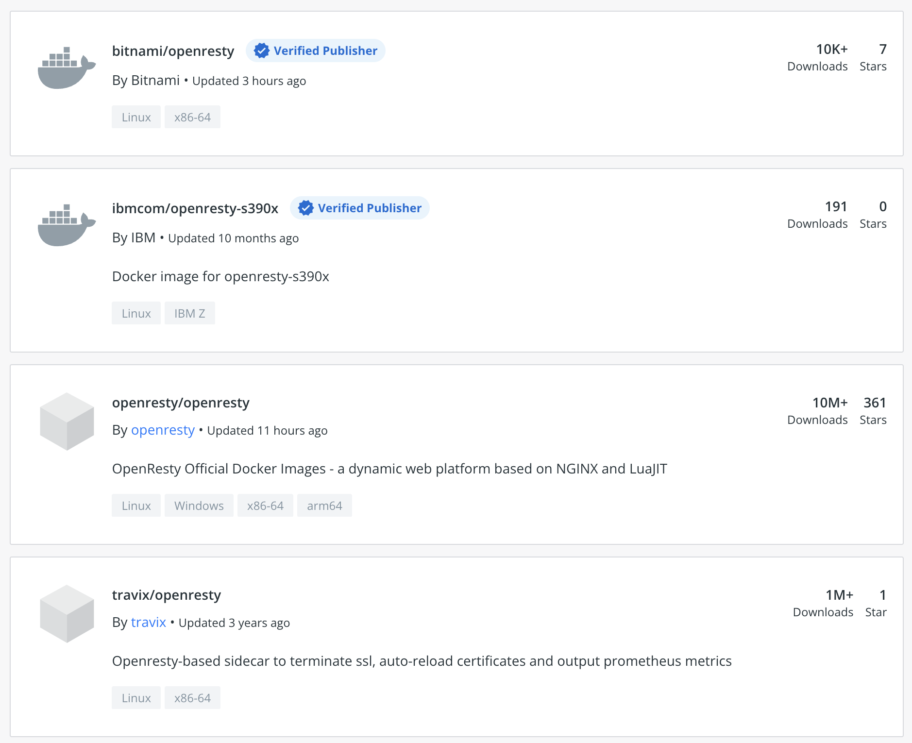 下面的这张截图就是OpenResty在Docker Hub上的搜索结果。可以看到,有两个认证发行商的镜像(Bitnami、IBM),但下载量都很少,还有一个“民间”镜像下载量虽然超过了1M,但更新时间是3年前,所以毫无疑问,我们应该选择排在第三位,但下载量超过10M、有360多个星的“半官方”镜像。