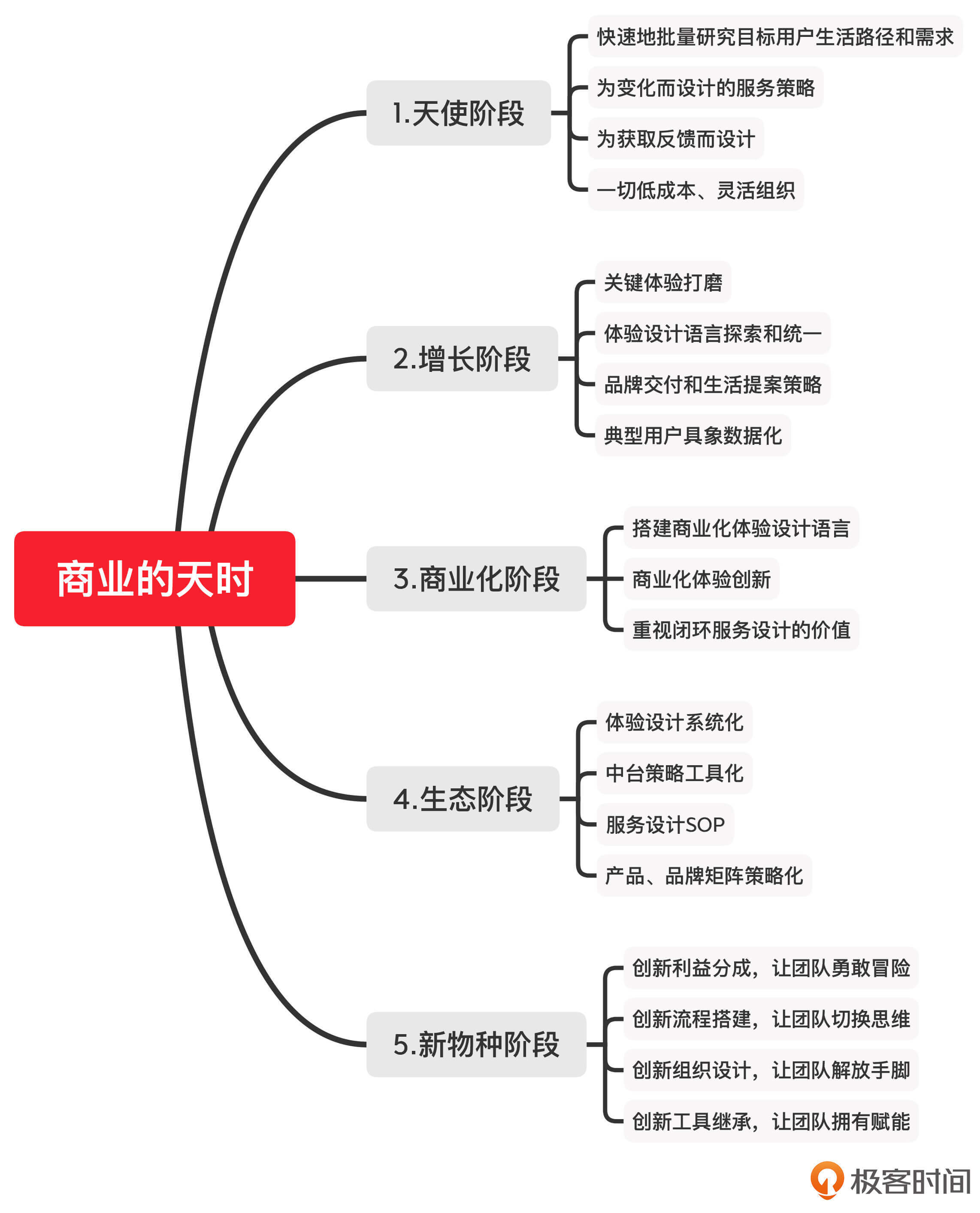 好了,天使、增长、商业化、生态和新物种这五个阶段就是我在每次工作时,会对客户进行的分类,并以此制定不同的体验设计策略。不过商业体面临的问题往往千差万别,所以你通常需要根据实际情况,混合使用不同的方法。