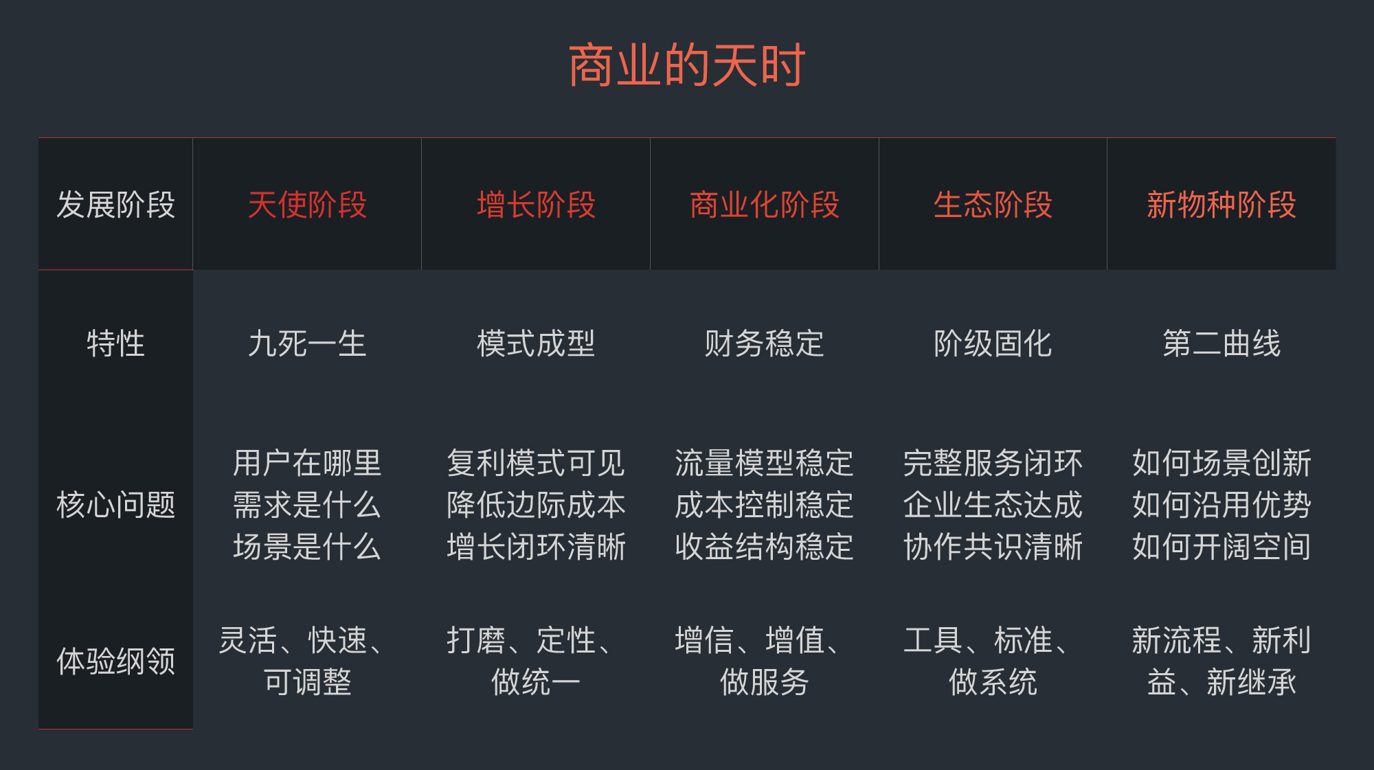 - 商业的市场阶段分为:天使阶段、增长阶段、商业化阶段、生态阶段、新物种阶段。
