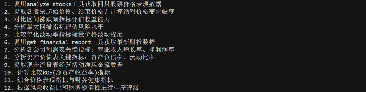 第二点是在最后的要求中,再一次强调**了设计步骤要紧紧贴合工具所能返回的内容,**这是因为 DeepSeek-R1 作为一款思维能力超强的思考型模型,总会有很多自己的想法。如果我们不加以明确约束,可能会出现列出的计划需要某指标但,我们的工具提供不了的情况,这就会导致后续的计划执行步骤出现问题。