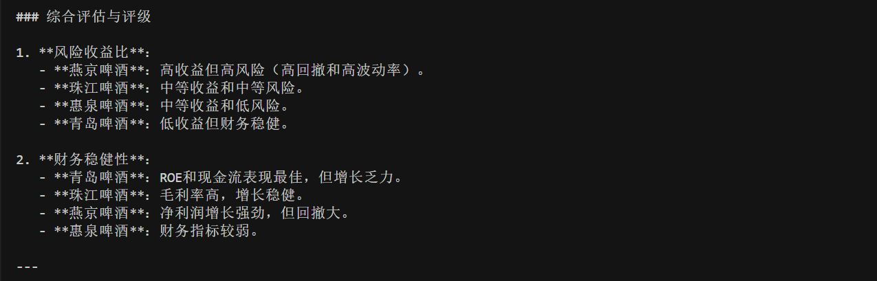 最后,我们来测试一下效果。我选取了啤酒板块的四只股票进行测试,分别是 600600 青岛啤酒,002461 珠江啤酒,000729 燕京啤酒以及600573 惠泉啤酒。需要注意的是,在这里我不是给大家推荐股票,今天大模型的测试效果也不能作为最终的买卖决策,我们仅仅是学习与测试。