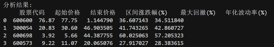 两行代码搞定,接下来计算区间涨跌幅。区间涨跌幅就很好理解了,就是用(区间最后一个交易日的收盘价-最开始的交易日的收盘价)/ 最开始的交易日的收盘价。代码如下: