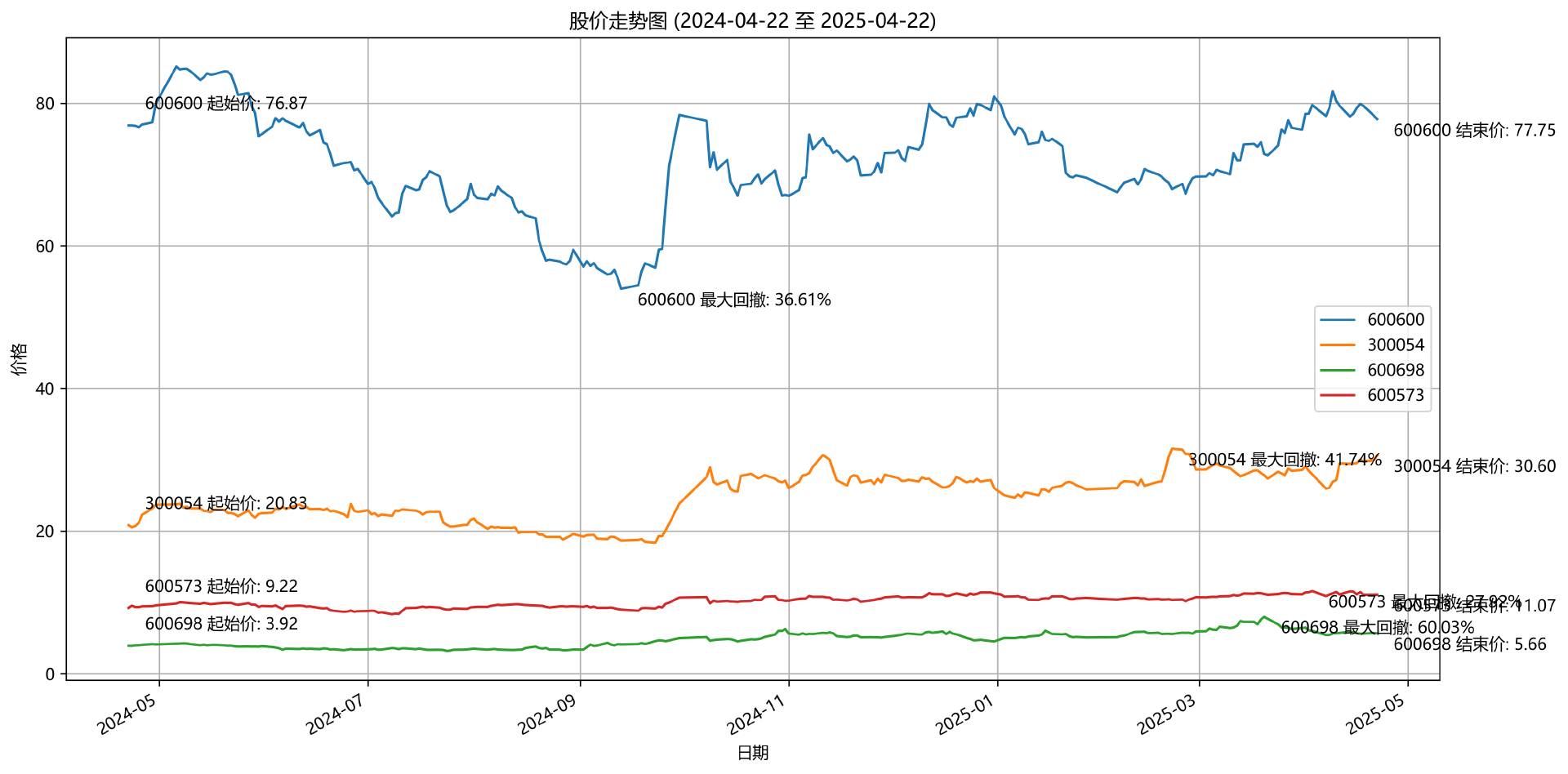 指标,主要是根据日 K 数据进行计算。本次我们就选取2024 年 4 月 22 日 ~ 2025 年 4 月 22 日 近一年的数据,来计算年化波动率、最大回撤、区间涨跌幅三个指标。
