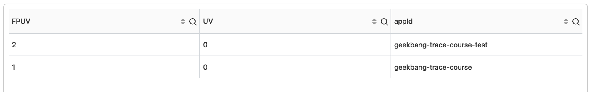 这段SQL的作用首先是筛选出错误级别的日志,然后查询统计出 fpId 的总数、 uid 的总数以及 appId 。最后,再基于 appId 分组显示数据。最终效果如下图所示。