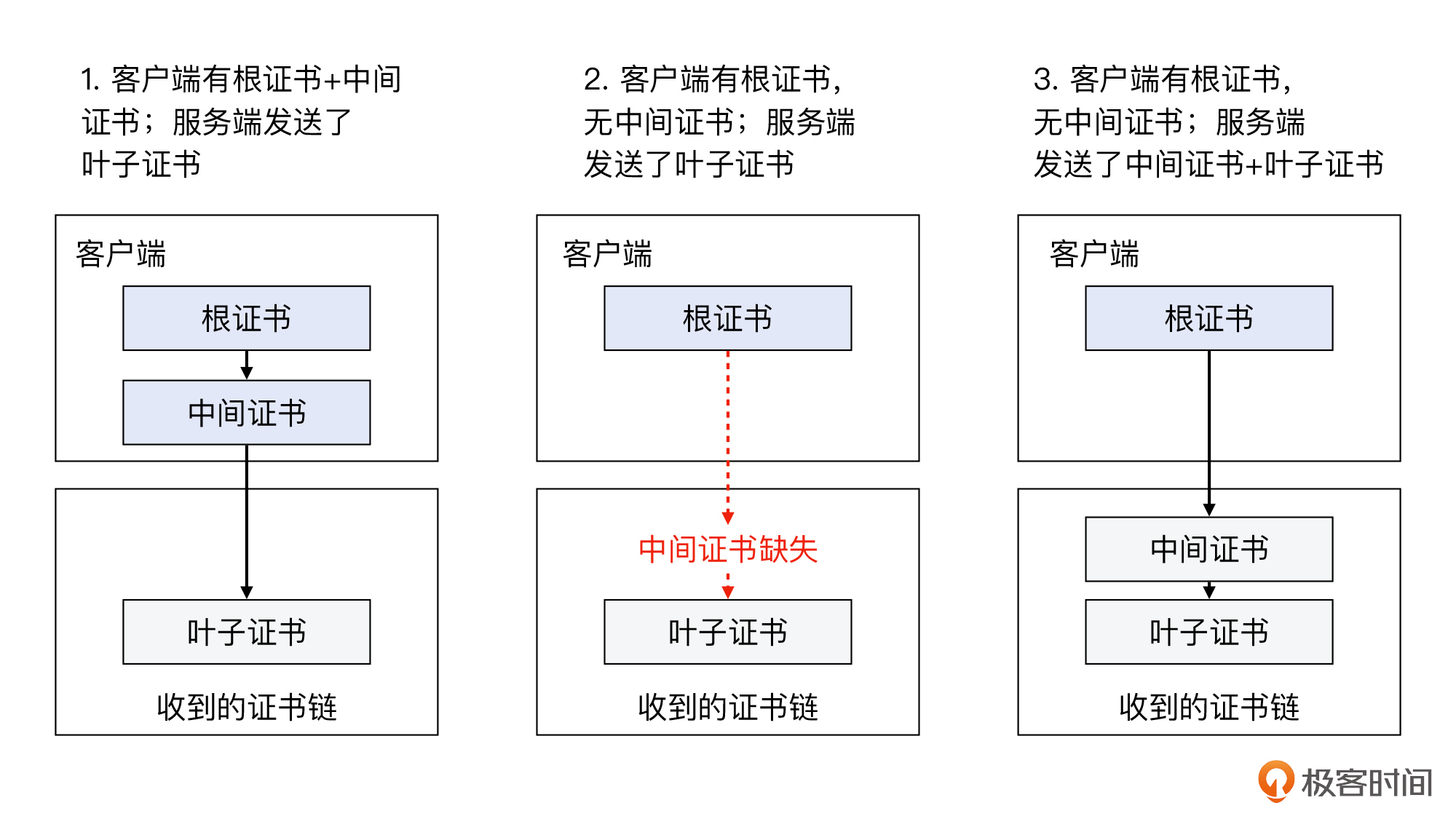 场景1和3中,信任链是完整的,证书验证就可以通过。场景2中,由于中间证书既不在客户端的Trust store里,也不在服务端回复的证书链中,这就导致信任链断裂,验证就会失败。