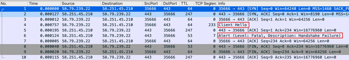 这段日志有没有告诉我们有价值的信息呢?好像并不多,只是告诉我们握手失败了。这也是我反复提及的,网络排查中两大鸿沟之一的应用现象跟网络现象之间的鸿沟:你可能看得懂应用层的日志,但是不知道网络上具体发生了什么。