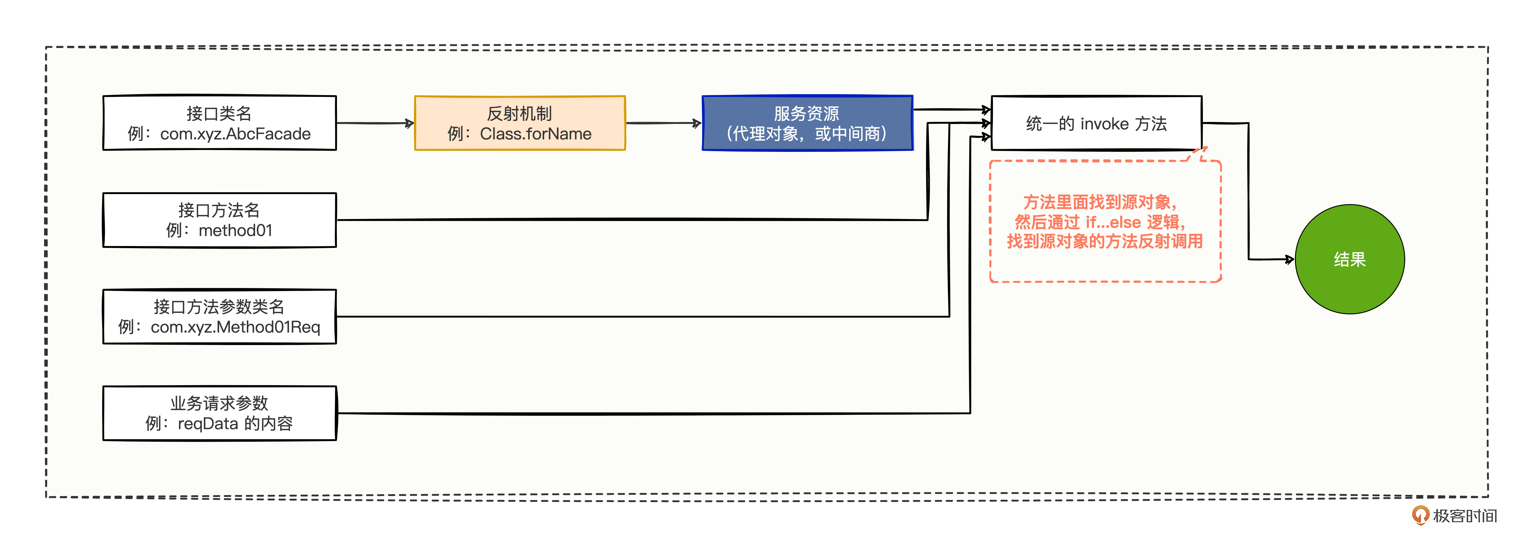 Javassist 编译 还是以上一讲的自定义代理为例。这张图你应该还有印象,我们尝试通过添加一层代理的方式,把各种 if…else 的硬编码逻辑转变为动态生成:
