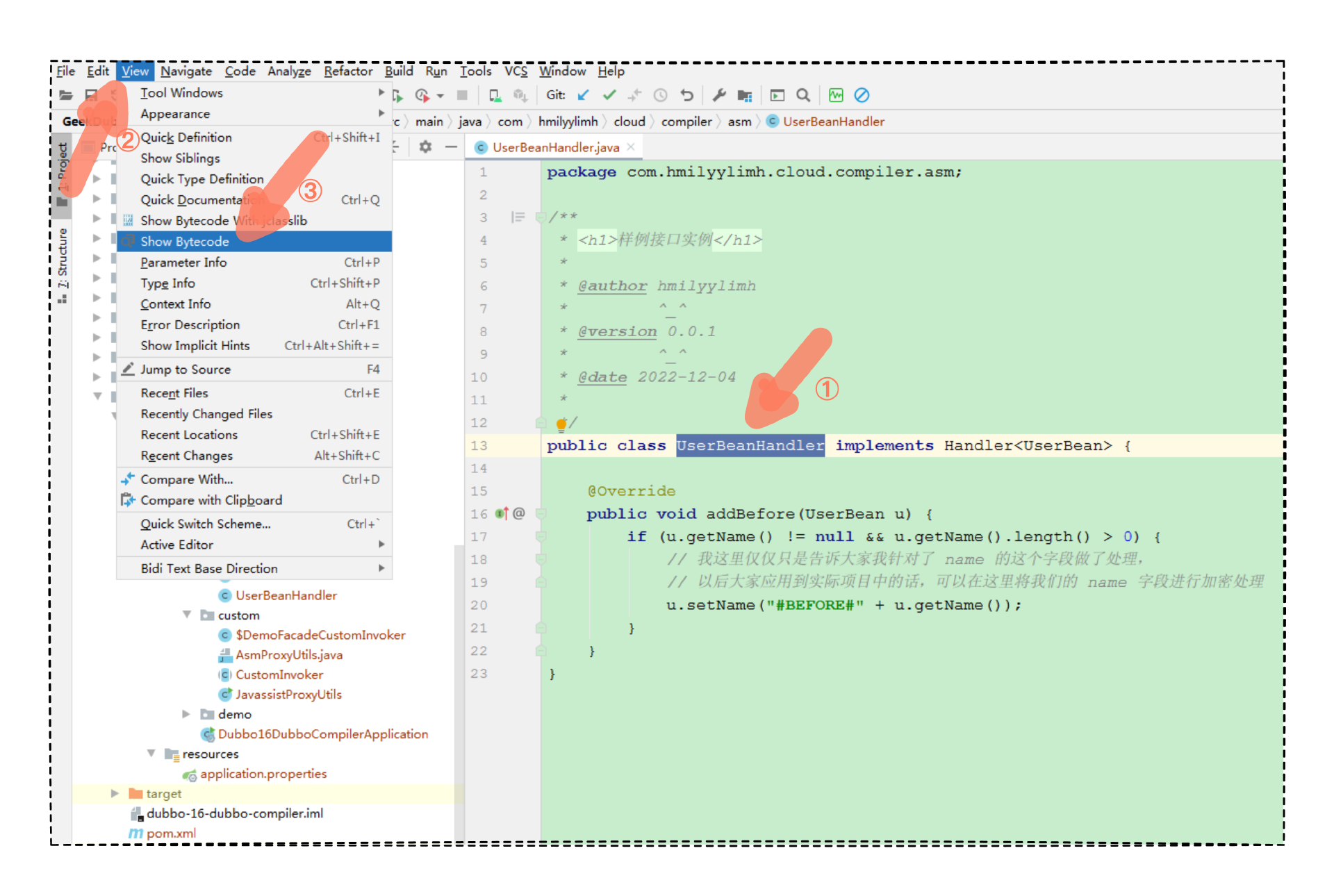 设计一个对象的代理类,暴露一个 addBefore 方法来将字段进行加密操作。 代理类为了迎合具备一个 addBefore 方法,就得设计出一个接口,避免 Java 类单继承无法扩展的瓶颈。 代码模板是定义好了,可是操作字节码的时候,去哪里弄到该 UserBeanHandler 的字节码呢?