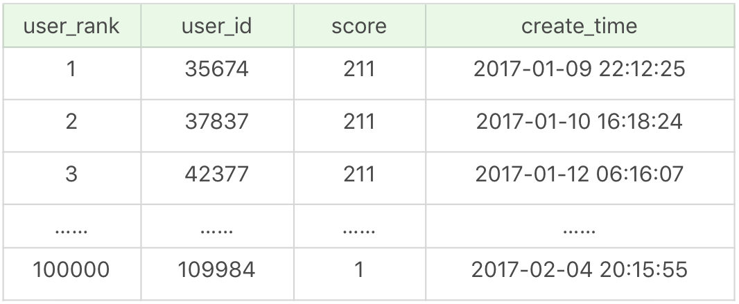 为了简化,玩家排行榜主要包括3个字段:user_id、score、和create_time,它们分别代表玩家的用户ID、玩家的积分和玩家的创建时间。