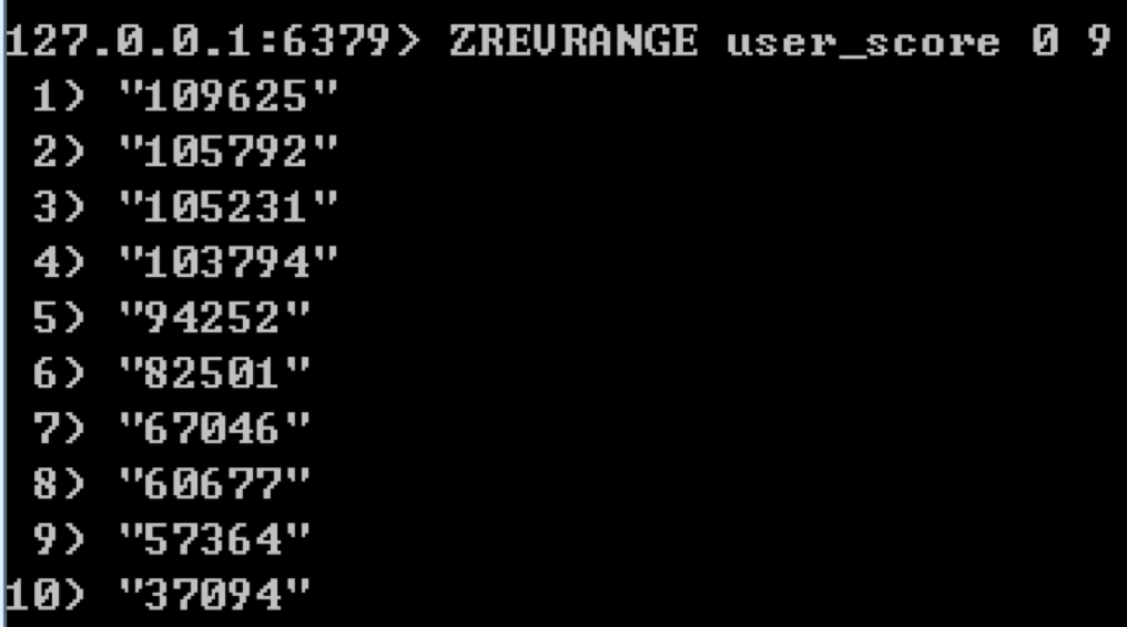 同样我们可以使用ZREVRANGE完成前N名玩家的排名,比如我们想要统计前10名玩家,可以使用:ZREVRANGE user_score 0 9。