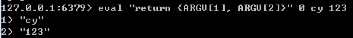 下面我们通过2个例子来体会下,比如我们使用eval "return {ARGV[1], ARGV[2]}" 0 cy 123,代表的是传入的key的个数为0,后面有两个arg,分别为cy和123。在Lua脚本中,我们直接返回这两个参数ARGV[1], ARGV[2],执行结果如下: