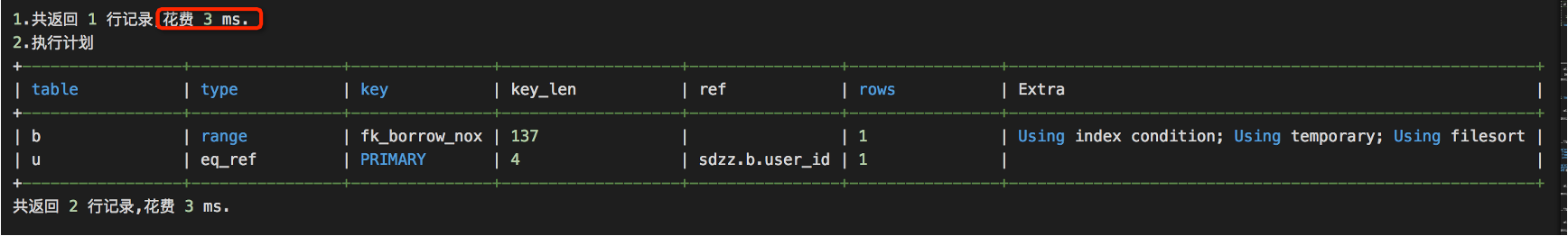 +----+--------------+-------------+--------+--------------------------+--------------+---------+---------------------+------+----------+---------------------------------+ | id | select_type | table | type | possible_keys | key | key_len | ref | rows | filtered | Extra | +----+--------------+-------------+--------+--------------------------+--------------+---------+---------------------+------+----------+---------------------------------+ | 1 | SIMPLE | <subquery2> | ALL | NULL | NULL | NULL | NULL | NULL | 100.00 | Using temporary; Using filesort | | 1 | SIMPLE | u | eq_ref | PRIMARY | PRIMARY | 4 | <subquery2>.user_id | 1 | 100.00 | NULL | | 1 | SIMPLE | ucd | ref | idx_userid | idx_userid | 4 | <subquery2>.user_id | 1 | 100.00 | Using where; Using index | | 2 | MATERIALIZED | b | range | idx_user_id,idx_borrowno | idx_borrowno | 123 | NULL | 10 | 100.00 | Using index condition | +----+--------------+-------------+--------+--------------------------+--------------+---------+---------------------+------+----------+---------------------------------+