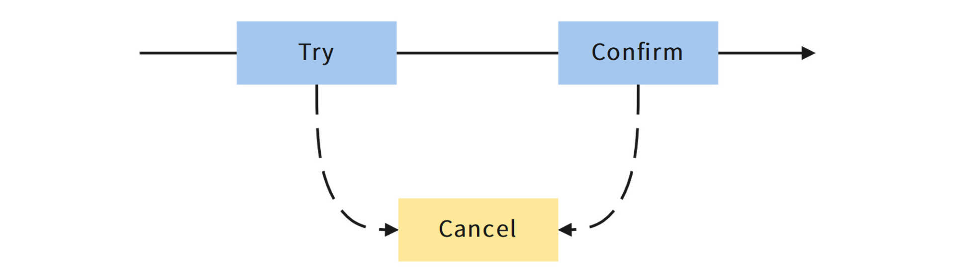 TCC名字里这三个字母分别是三个单词的首字母缩写,从前到后分别是Try、Confirm和Cancel,这三个单词分别对应了TCC模式的三个执行阶段,每一个阶段都是独立的本地事务。
