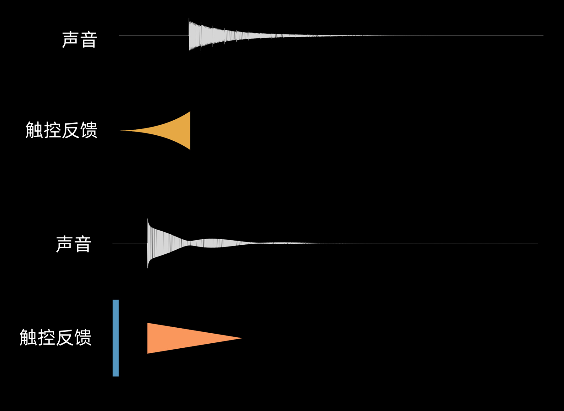 接下来我们谈谈声触协同。和视听、视触协同不同,在声触协同体验中,触控反馈的表现力远远低于听觉,所以如果你想通过触觉模拟声音的频率、音色的话,在很多时候是困难且没有必要的。