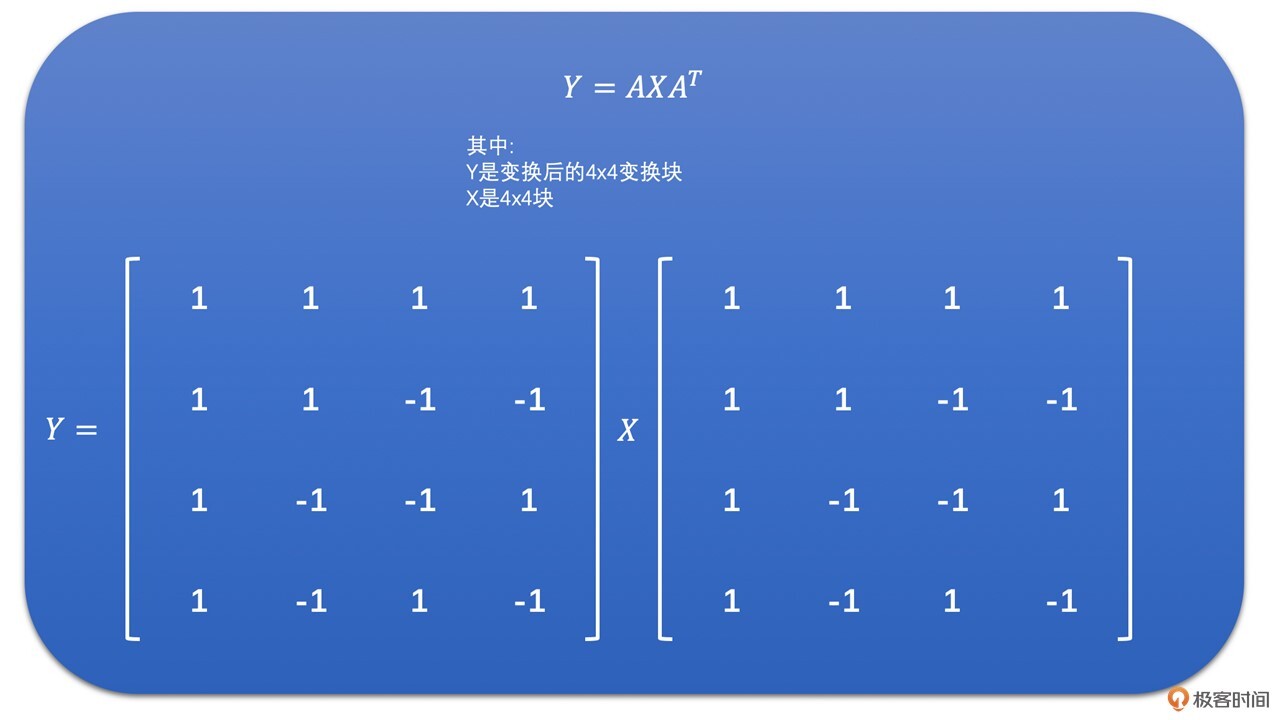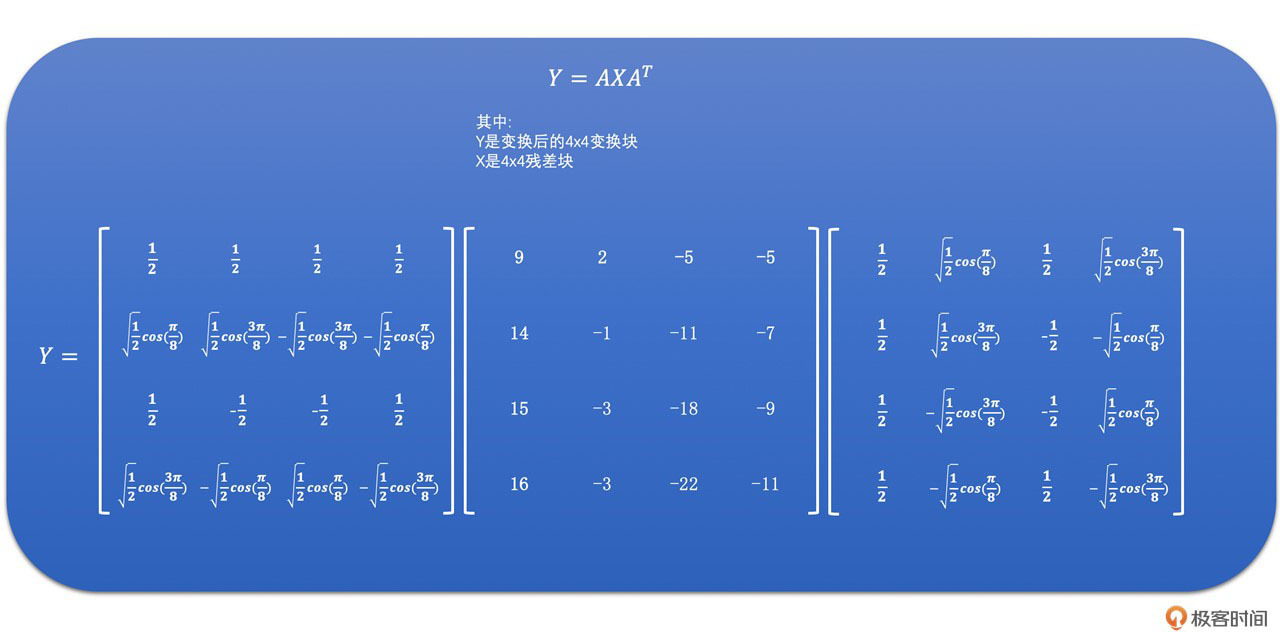 我们将点乘左边的部分取出来,就是H264中的整数变换了。公式如下: