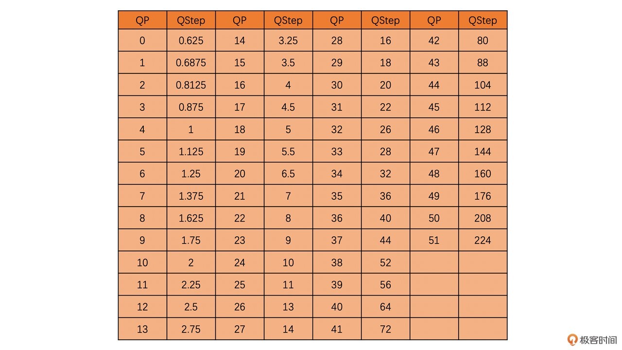 其中,在H264中QP和QStep之间的转换表格如下: