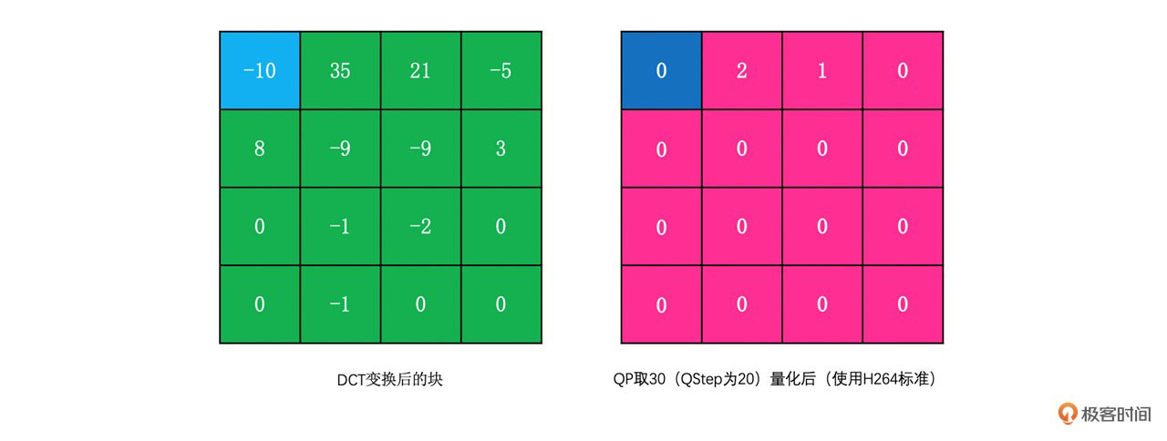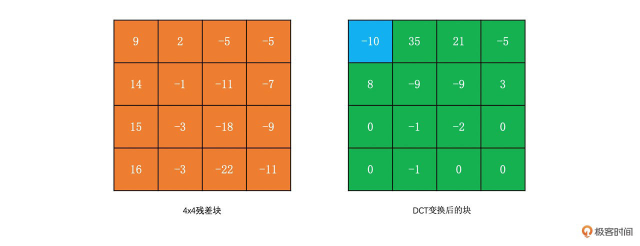为了让你更好地理解DCT变换,我们通过下面的例子来看一下4x4的残差块的DCT变换结果。我们称左上角的系数为DC系数,而其它系数为AC系数。