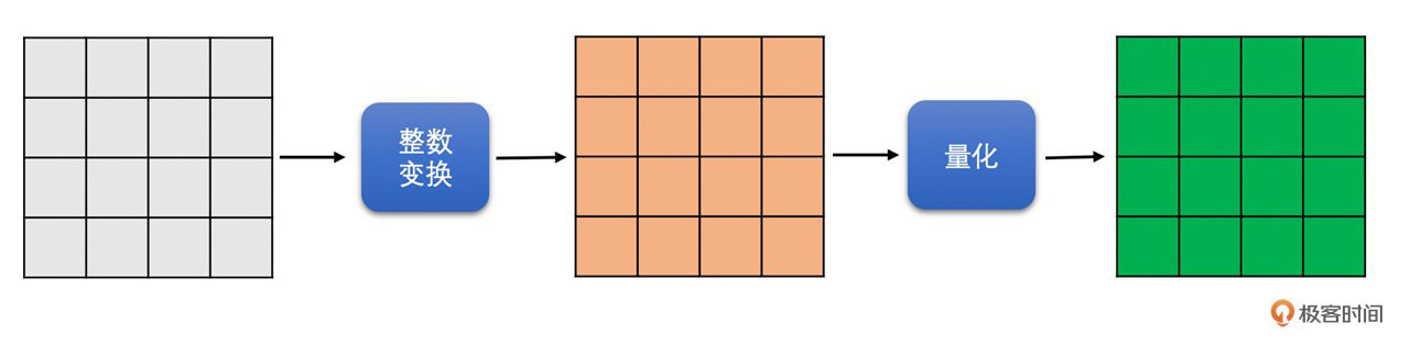 为了让你更透彻地了解视频编码中的DCT变换和量化的原理,在这节课里面,我们会对DCT变换和量化的过程做一个深入的探讨。通过下图你可以很清楚地看到视频编码的过程,并且能够更直观地感受DCT变换和量化在整个视频编码过程中的重要性。