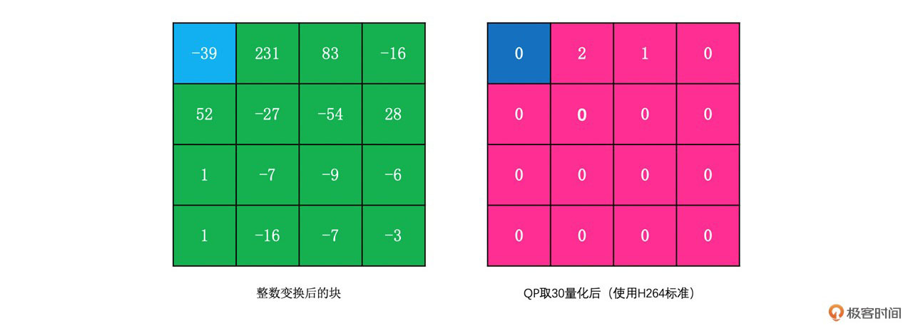 同样,上面整数变换之后,我们用H264的量化公式对其进行量化后得到的结果如下: