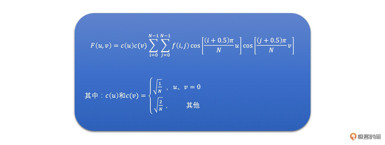 二维DCT变换公式如下,其中f(i, j)是指第(i, j)位置的样点的信号值,N代表信号样点的总个数。