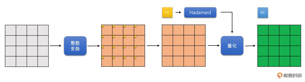 亮度16x16块,首先被划分成16个4x4的小块做整数变换。变换之后将16个4x4小块的DC系数都拿出来,组成一个4x4的DC块,再对这个4x4的DC块进行Hadamard变换。然后,再总体进行量化操作。