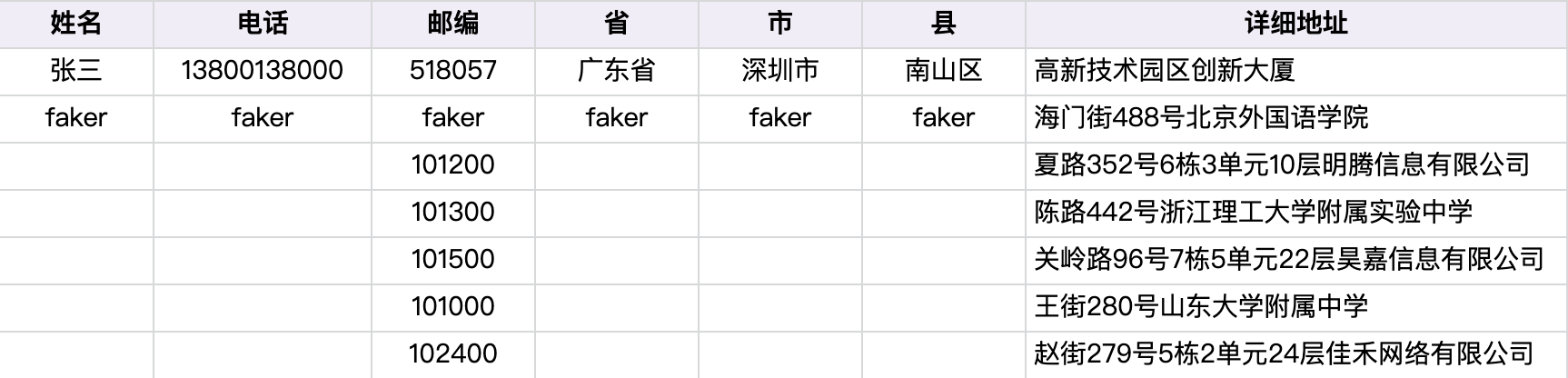 1 | 13800138000,张三,广东省深圳市南山区高新技术园区创新大厦,518057 |