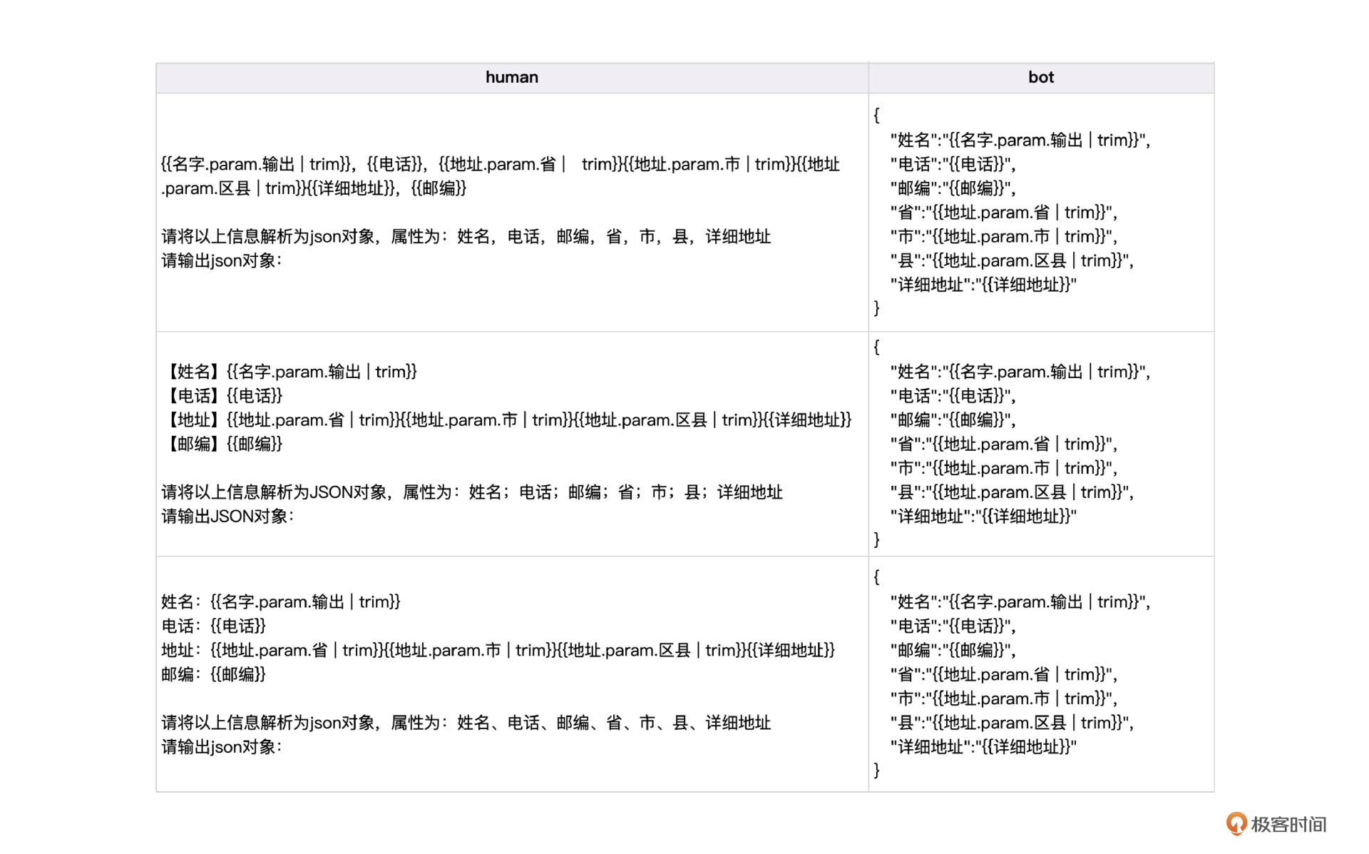 我们知道,微调大模型需要同时输入human和bot的对话数据,因此还需要把bot的输出格式也制作成Jinja2模版,下面的表格显示了这个场景下完整的Jinja2模版。