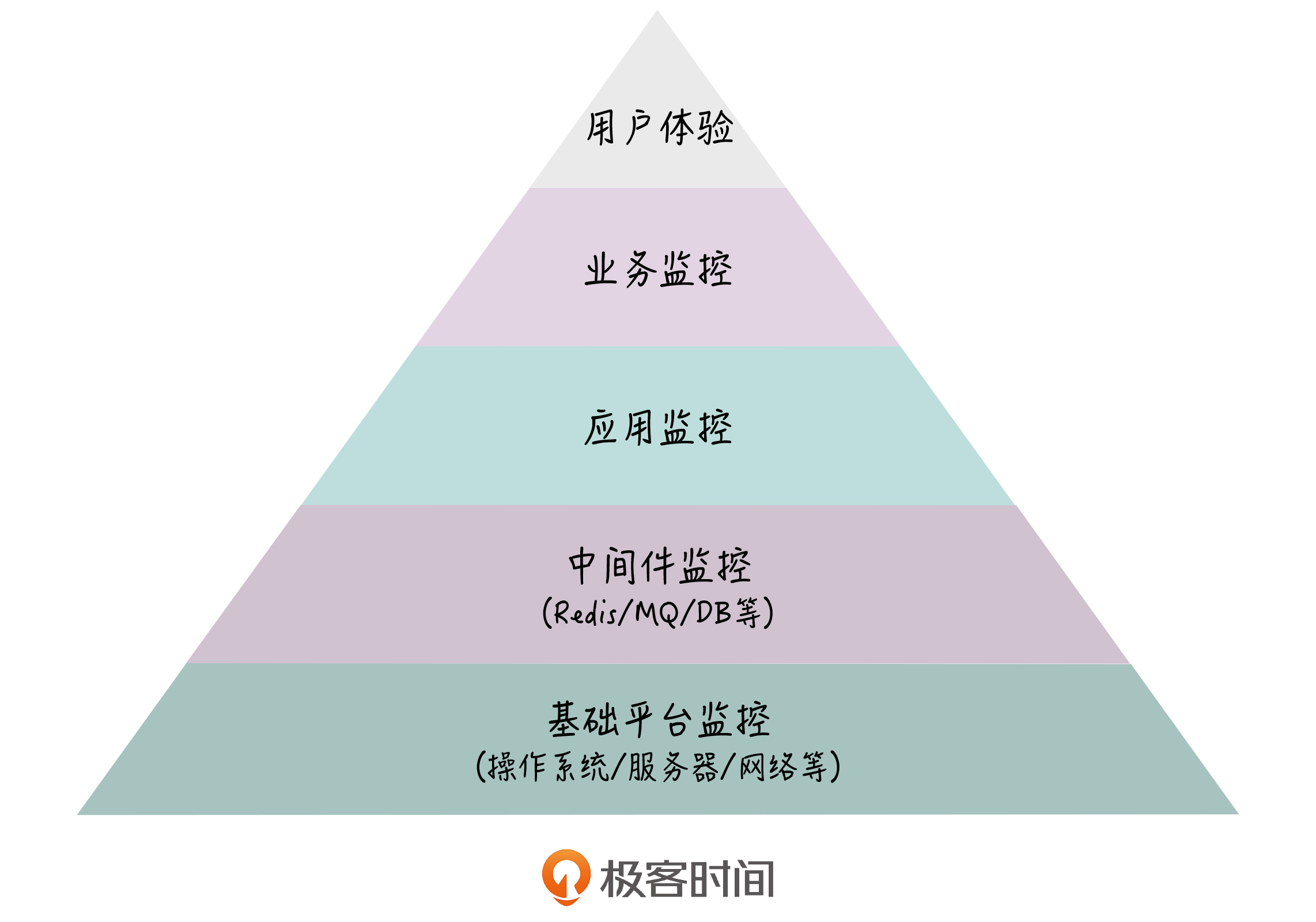 在[第11讲]中,我和你介绍了系统的组成,它包括接入层、应用系统、中间件、基础设施这几个部分,那我们的监控也是针对这些部分来实施的。一般来说,监控可以分为5个层次,如下图所示: