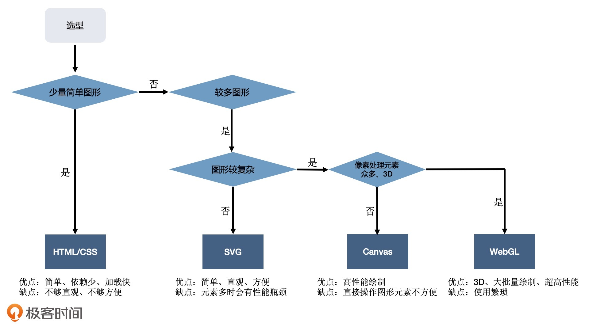 知道了这些优缺点,在实际面对可视化需求的时候,我们就可以根据具体项目的特点来选择合适的方案实现可视化了。那具体来说,我们应该怎么选择呢?我这里梳理了一张技术方案的选择图,你可以看一看。