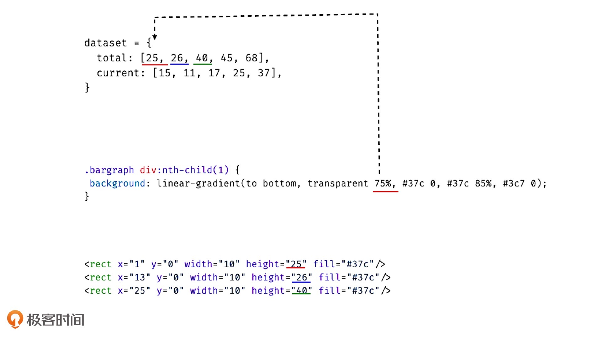 从上面的SVG代码中,我们可以一目了然地看出,数据total和current分别对应SVG中两个g元素下的rect元素的高度。也就是说,元素的属性和数值可以直接对应起来。而CSS代码并不能直观体现出数据的数值,需要进行CSS规则转换。具体如下图所示: