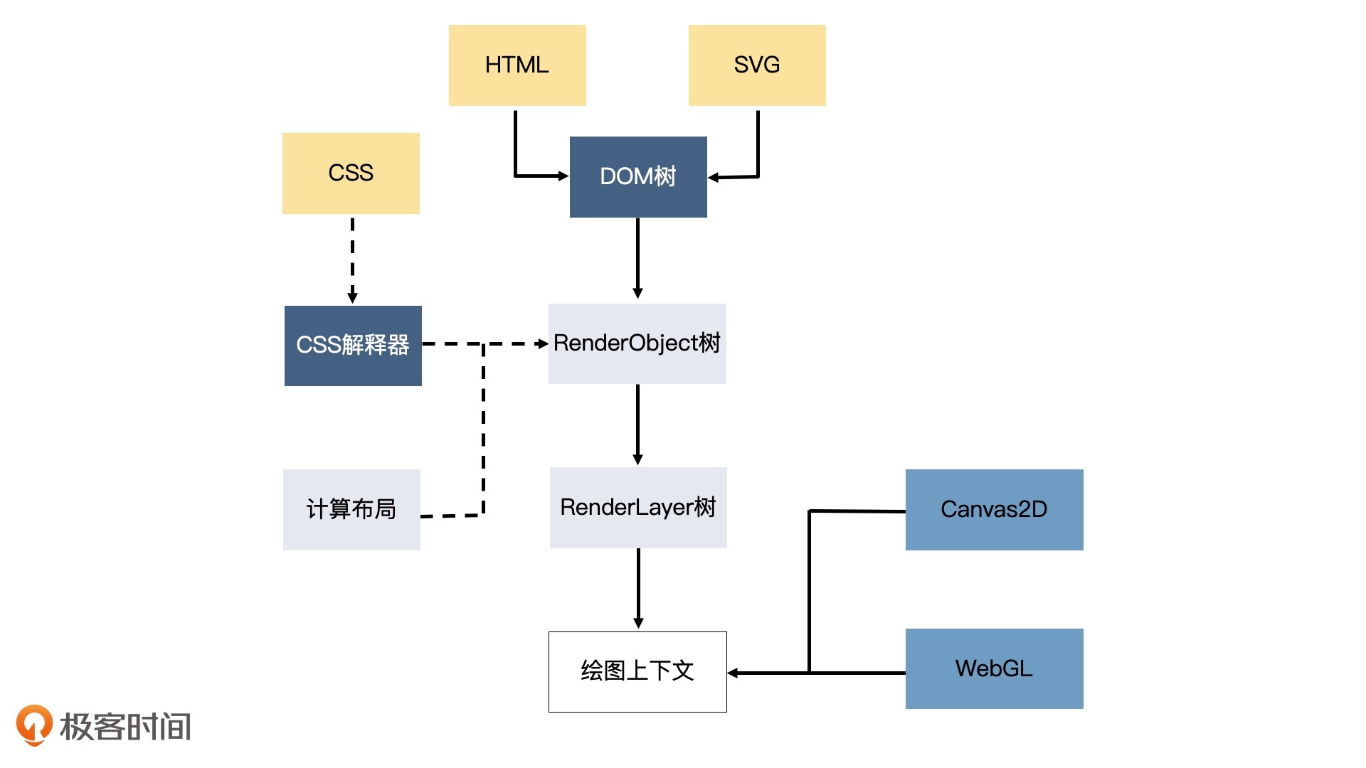 其次,HTML和CSS作为浏览器渲染引擎的一部分,为了完成页面渲染的工作,除了绘制图形外,还要做很多额外的工作。比如说,浏览器的渲染引擎在工作时,要先解析HTML、SVG、CSS,构建DOM树、RenderObject树和RenderLayer树,然后用HTML(或SVG)绘图。当图形发生变化时,我们很可能要重新执行全部的工作,这样的性能开销是非常大的。