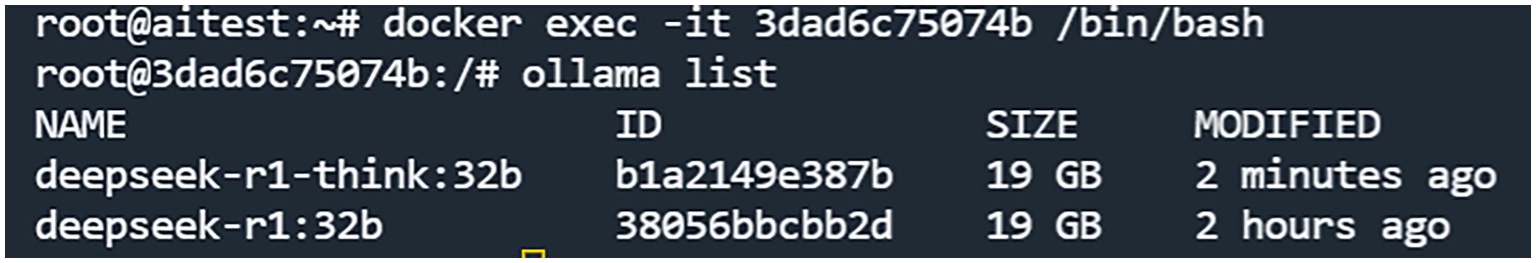 我们需要进入到 Ollama 容器的内部,去执行模型运行命令。进入容器的命令为: