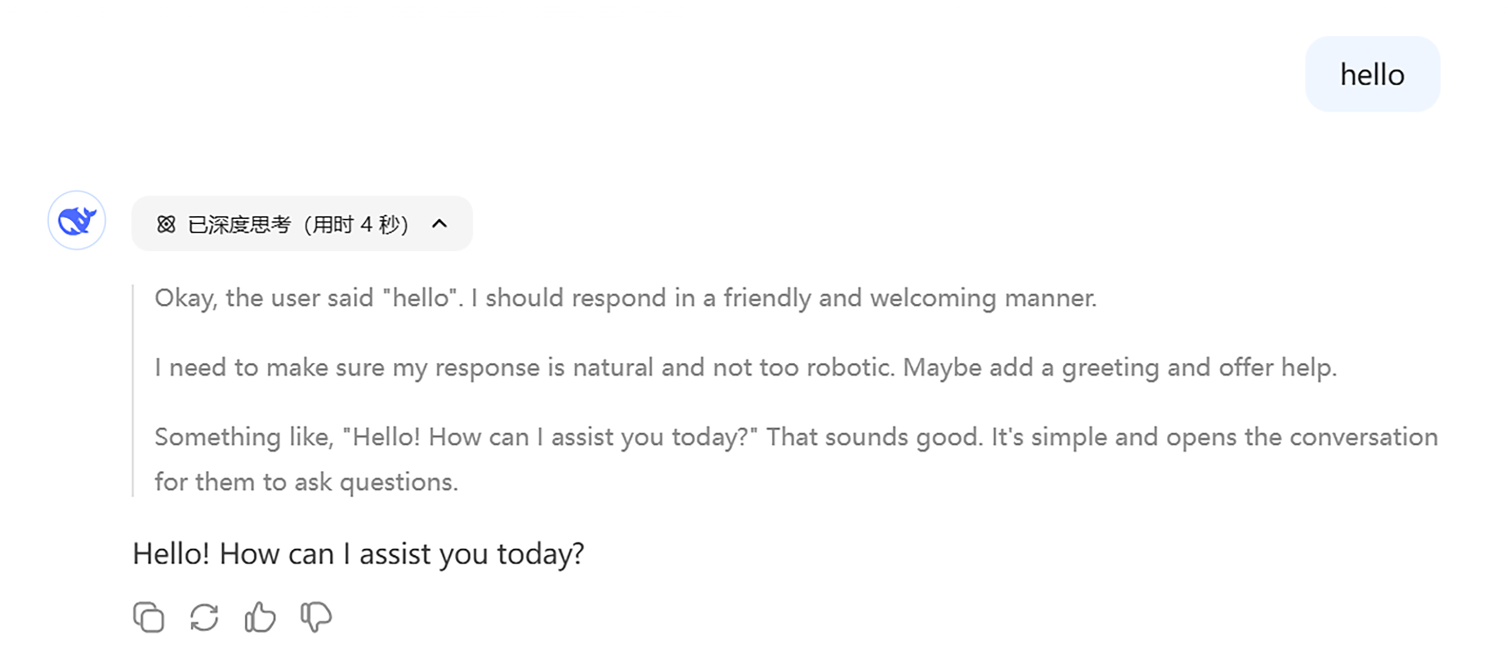 可以看到,模型带有 DeepSeek-R1 标志性的 <think></think> 也就是深度思考,但是由于我们问的问题太简单了,模型认为不需要深度思考就能回答,因此就直接回答了。
