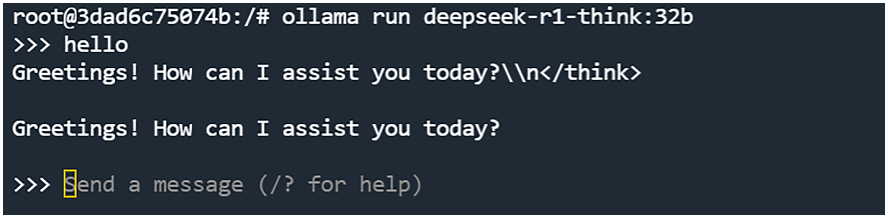使用如下命令,将模型 deepseek-r1-think:32b 运行起来,然后测试: