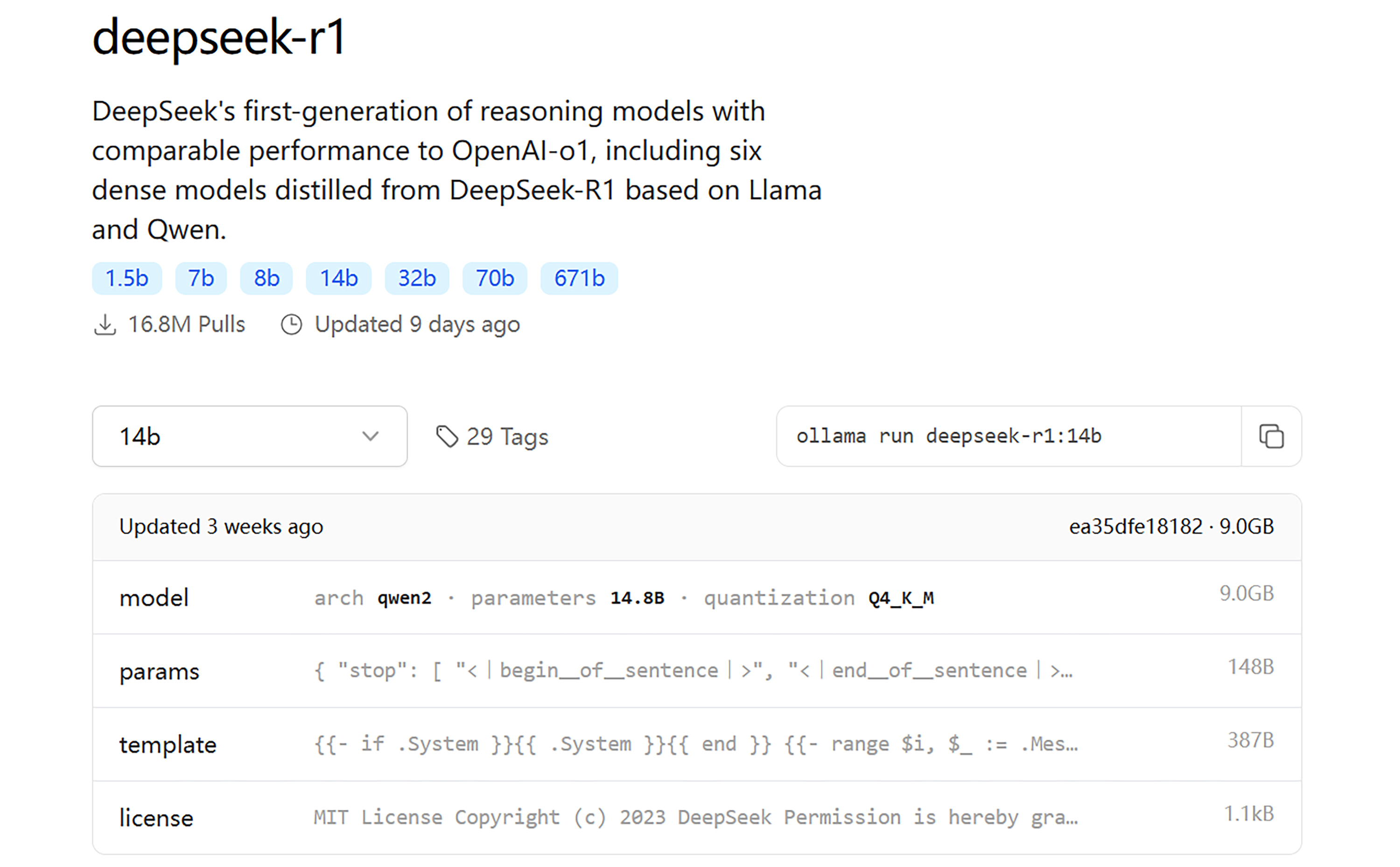 点开链接后,第一个就是 DeepSeek-R1 模型,分为 1.5b 到 671b 多个版本。