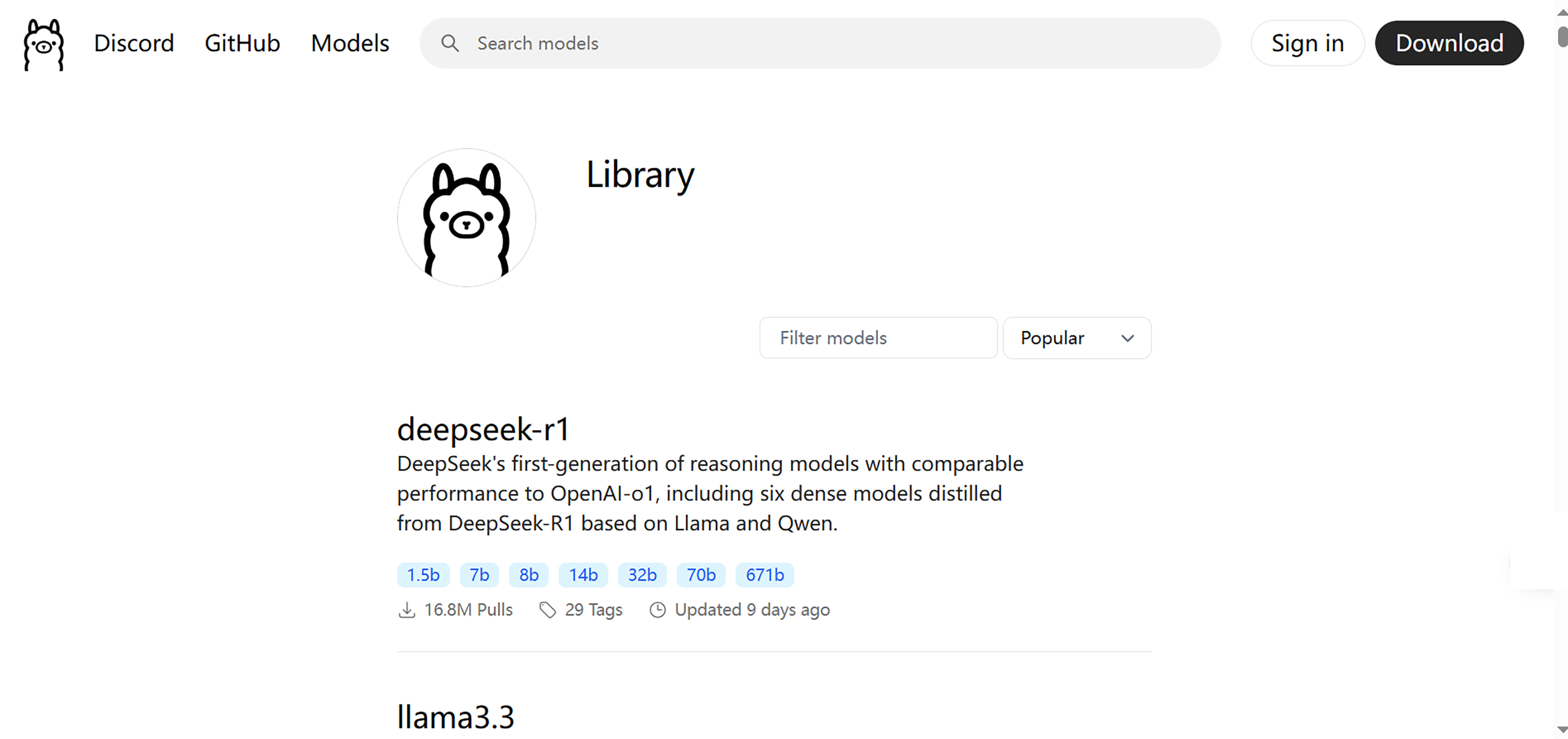 Ollama 官方提供了一个可视化的模型仓库,便于我们了解 Ollama 已经支持了哪些模型,以及下载模型。仓库的地址是:https://ollama.com/library